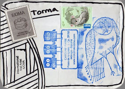 Új mail artostól kaptam a küldeményt, ha jól tájkozódtam, az átdolgozott képeslapon saját festményei láthatók, egy kis galériája is van. Régóta foglalkoztat az 'újnaivizmus'. Senkit ne tévesszen meg a boríték szélének furcsa színe, de hiába, a szkennerek nem ismerik a világító festékkel készült színeket. Welcome Caroline, thank you!